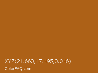XYZ 21.663,17.495,3.046 Color is a normal orange color and the nearest color is Reno Sand #a86515. Hex code #ad6117 and RGB value is rgb(173,97,23). In RGB color space, this color is composed of 68% red, 38% green, 9% blue, In CMYK color space, this color is composed of 0% cyan, 44% magenta, 87% yellow , 32% black , In HSL color space, this color has a hue angle of 30° , 77% saturation and 38% lightness.
