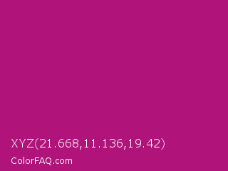XYZ 21.668,11.136,19.42 Color is a normal magenta color and the nearest color is Red Violet #c71585. Hex code #b0147a and RGB value is rgb(176,20,122). In RGB color space, this color is composed of 69% red, 8% green, 48% blue, In CMYK color space, this color is composed of 0% cyan, 89% magenta, 31% yellow , 31% black , In HSL color space, this color has a hue angle of 321° , 80% saturation and 38% lightness.