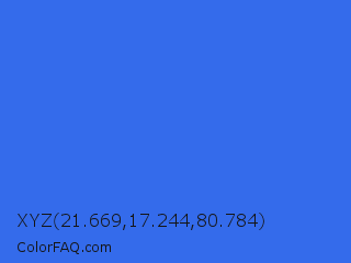 XYZ 21.669,17.244,80.784 Color is a normal blue color and the nearest color is Royal Blue #4169e1. Hex code #346beb and RGB value is rgb(52,107,235). In RGB color space, this color is composed of 20% red, 42% green, 92% blue, In CMYK color space, this color is composed of 78% cyan, 54% magenta, 0% yellow , 8% black , In HSL color space, this color has a hue angle of 222° , 82% saturation and 56% lightness.