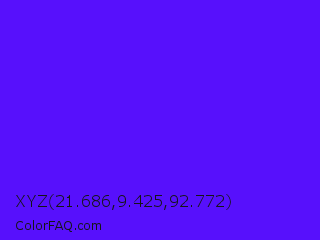 XYZ 21.686,9.425,92.772 Color is a normal indigo color and the nearest color is Han Purple #5218fa. Hex code #5710fc and RGB value is rgb(87,16,252). In RGB color space, this color is composed of 34% red, 6% green, 99% blue, In CMYK color space, this color is composed of 65% cyan, 94% magenta, 0% yellow , 1% black , In HSL color space, this color has a hue angle of 258° , 98% saturation and 53% lightness.