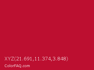 XYZ 21.691,11.374,3.848 Color is a normal red color and the nearest color is Shiraz #b20931. Hex code #bd0f30 and RGB value is rgb(189,15,48). In RGB color space, this color is composed of 74% red, 6% green, 19% blue, In CMYK color space, this color is composed of 0% cyan, 92% magenta, 75% yellow , 26% black , In HSL color space, this color has a hue angle of 349° , 85% saturation and 40% lightness.