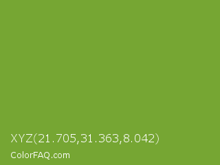 XYZ 21.705,31.363,8.042 Color is a normal green color and the nearest color is Sushi #87ab39. Hex code #76a633 and RGB value is rgb(118,166,51). In RGB color space, this color is composed of 46% red, 65% green, 20% blue, In CMYK color space, this color is composed of 29% cyan, 0% magenta, 69% yellow , 35% black , In HSL color space, this color has a hue angle of 85° , 53% saturation and 43% lightness.