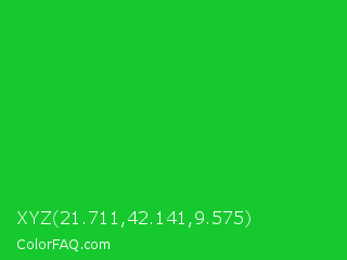 XYZ 21.711,42.141,9.575 Color is a normal green color and the nearest color is Vivid Malachite #00cc33. Hex code #16c92e and RGB value is rgb(22,201,46). In RGB color space, this color is composed of 9% red, 79% green, 18% blue, In CMYK color space, this color is composed of 89% cyan, 0% magenta, 77% yellow , 21% black , In HSL color space, this color has a hue angle of 128° , 80% saturation and 44% lightness.