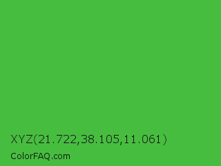 XYZ 21.722,38.105,11.061 Color is a normal green color and the nearest color is Apple #4fa83d. Hex code #47bd40 and RGB value is rgb(71,189,64). In RGB color space, this color is composed of 28% red, 74% green, 25% blue, In CMYK color space, this color is composed of 62% cyan, 0% magenta, 66% yellow , 26% black , In HSL color space, this color has a hue angle of 117° , 49% saturation and 50% lightness.