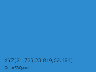XYZ 21.723,23.819,62.484 Color is a normal blue color and the nearest color is Curious Blue #2596d1. Hex code #2d8ccf and RGB value is rgb(45,140,207). In RGB color space, this color is composed of 18% red, 55% green, 81% blue, In CMYK color space, this color is composed of 78% cyan, 32% magenta, 0% yellow , 19% black , In HSL color space, this color has a hue angle of 205° , 64% saturation and 49% lightness.