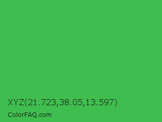 XYZ 21.723,38.05,13.597 Color is a normal green color and the nearest color is Chateau Green #40a860. Hex code #40bd4f and RGB value is rgb(64,189,79). In RGB color space, this color is composed of 25% red, 74% green, 31% blue, In CMYK color space, this color is composed of 66% cyan, 0% magenta, 58% yellow , 26% black , In HSL color space, this color has a hue angle of 127° , 49% saturation and 50% lightness.
