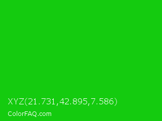 XYZ 21.731,42.895,7.586 Color is a normal green color and the nearest color is Vivid Malachite #00cc33. Hex code #14cb0f and RGB value is rgb(20,203,15). In RGB color space, this color is composed of 8% red, 80% green, 6% blue, In CMYK color space, this color is composed of 90% cyan, 0% magenta, 93% yellow , 20% black , In HSL color space, this color has a hue angle of 118° , 86% saturation and 43% lightness.
