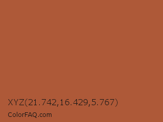 XYZ 21.742,16.429,5.767 Color is a normal orange color and the nearest color is Brown Rust #af593e. Hex code #ae5938 and RGB value is rgb(174,89,56). In RGB color space, this color is composed of 68% red, 35% green, 22% blue, In CMYK color space, this color is composed of 0% cyan, 49% magenta, 68% yellow , 32% black , In HSL color space, this color has a hue angle of 17° , 51% saturation and 45% lightness.