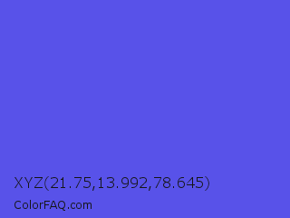 XYZ 21.75,13.992,78.645 Color is a light indigo color and the nearest color is Majorelle Blue #6050dc. Hex code #5852e9 and RGB value is rgb(88,82,233). In RGB color space, this color is composed of 35% red, 32% green, 91% blue, In CMYK color space, this color is composed of 62% cyan, 65% magenta, 0% yellow , 9% black , In HSL color space, this color has a hue angle of 242° , 77% saturation and 62% lightness.
