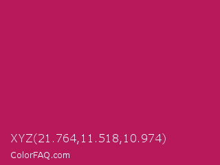 XYZ 21.764,11.518,10.974 Color is a normal rose color and the nearest color is Rose Red #c21e56. Hex code #b7195b and RGB value is rgb(183,25,91). In RGB color space, this color is composed of 72% red, 10% green, 36% blue, In CMYK color space, this color is composed of 0% cyan, 86% magenta, 50% yellow , 28% black , In HSL color space, this color has a hue angle of 335° , 76% saturation and 41% lightness.