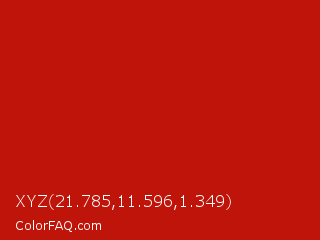 XYZ 21.785,11.596,1.349 Color is a normal red color and the nearest color is International Orange Engineering #ba160c. Hex code #bf1409 and RGB value is rgb(191,20,9). In RGB color space, this color is composed of 75% red, 8% green, 4% blue, In CMYK color space, this color is composed of 0% cyan, 90% magenta, 95% yellow , 25% black , In HSL color space, this color has a hue angle of 4° , 91% saturation and 39% lightness.