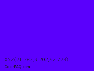 XYZ 21.787,9.202,92.723 Color is a normal violet color and the nearest color is Electric Indigo #6f00ff. Hex code #5a00fc and RGB value is rgb(90,0,252). In RGB color space, this color is composed of 35% red, 0% green, 99% blue, In CMYK color space, this color is composed of 64% cyan, 100% magenta, 0% yellow , 1% black , In HSL color space, this color has a hue angle of 261° , 100% saturation and 49% lightness.