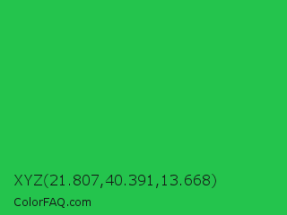 XYZ 21.807,40.391,13.668 Color is a normal green color and the nearest color is Lime Green #32cd32. Hex code #24c44d and RGB value is rgb(36,196,77). In RGB color space, this color is composed of 14% red, 77% green, 30% blue, In CMYK color space, this color is composed of 82% cyan, 0% magenta, 61% yellow , 23% black , In HSL color space, this color has a hue angle of 135° , 69% saturation and 45% lightness.