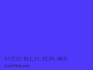 XYZ 21.811,11.35,91.484 Color is a normal indigo color and the nearest color is Han Purple #5218fa. Hex code #4e38fa and RGB value is rgb(78,56,250). In RGB color space, this color is composed of 31% red, 22% green, 98% blue, In CMYK color space, this color is composed of 69% cyan, 78% magenta, 0% yellow , 2% black , In HSL color space, this color has a hue angle of 247° , 95% saturation and 60% lightness.