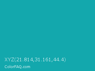 XYZ 21.814,31.161,44.4 Color is a normal cyan color and the nearest color is Light Sea Green #20b2aa. Hex code #13a8ad and RGB value is rgb(19,168,173). In RGB color space, this color is composed of 7% red, 66% green, 68% blue, In CMYK color space, this color is composed of 89% cyan, 3% magenta, 0% yellow , 32% black , In HSL color space, this color has a hue angle of 182° , 80% saturation and 38% lightness.