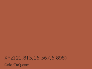 XYZ 21.815,16.567,6.898 Color is a normal red color and the nearest color is Brown Rust #af593e. Hex code #ad5a40 and RGB value is rgb(173,90,64). In RGB color space, this color is composed of 68% red, 35% green, 25% blue, In CMYK color space, this color is composed of 0% cyan, 48% magenta, 63% yellow , 32% black , In HSL color space, this color has a hue angle of 14° , 46% saturation and 46% lightness.