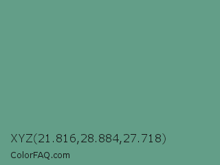 XYZ 21.816,28.884,27.718 Color is a normal green color and the nearest color is Patina #639a8f. Hex code #639e88 and RGB value is rgb(99,158,136). In RGB color space, this color is composed of 39% red, 62% green, 53% blue, In CMYK color space, this color is composed of 37% cyan, 0% magenta, 14% yellow , 38% black , In HSL color space, this color has a hue angle of 158° , 23% saturation and 50% lightness.