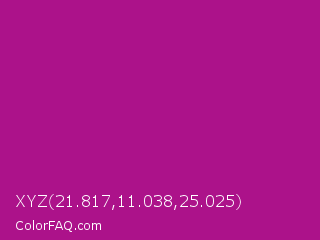 XYZ 21.817,11.038,25.025 Color is a normal magenta color and the nearest color is Violet Eggplant #991199. Hex code #ac128a and RGB value is rgb(172,18,138). In RGB color space, this color is composed of 67% red, 7% green, 54% blue, In CMYK color space, this color is composed of 0% cyan, 90% magenta, 20% yellow , 33% black , In HSL color space, this color has a hue angle of 313° , 81% saturation and 37% lightness.