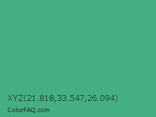 XYZ 21.818,33.547,26.094 Color is a normal green color and the nearest color is Ocean Green #41aa78. Hex code #46af81 and RGB value is rgb(70,175,129). In RGB color space, this color is composed of 27% red, 69% green, 51% blue, In CMYK color space, this color is composed of 60% cyan, 0% magenta, 26% yellow , 31% black , In HSL color space, this color has a hue angle of 154° , 43% saturation and 48% lightness.