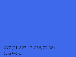 XYZ 21.827,17.036,79.98 Color is a normal blue color and the nearest color is Royal Blue #4169e1. Hex code #3d69ea and RGB value is rgb(61,105,234). In RGB color space, this color is composed of 24% red, 41% green, 92% blue, In CMYK color space, this color is composed of 74% cyan, 55% magenta, 0% yellow , 8% black , In HSL color space, this color has a hue angle of 225° , 80% saturation and 58% lightness.
