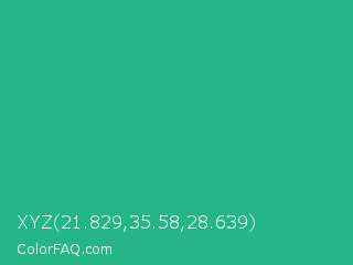 XYZ 21.829,35.58,28.639 Color is a normal green color and the nearest color is Mountain Meadow Crayola #1ab385. Hex code #24b687 and RGB value is rgb(36,182,135). In RGB color space, this color is composed of 14% red, 71% green, 53% blue, In CMYK color space, this color is composed of 80% cyan, 0% magenta, 26% yellow , 29% black , In HSL color space, this color has a hue angle of 161° , 67% saturation and 43% lightness.