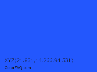 XYZ 21.831,14.266,94.531 Color is a normal blue color and the nearest color is Blue Crayola #1f75fe. Hex code #2357fd and RGB value is rgb(35,87,253). In RGB color space, this color is composed of 14% red, 34% green, 99% blue, In CMYK color space, this color is composed of 86% cyan, 66% magenta, 0% yellow , 1% black , In HSL color space, this color has a hue angle of 226° , 98% saturation and 56% lightness.