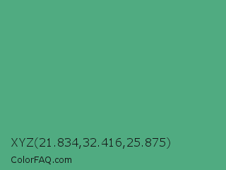 XYZ 21.834,32.416,25.875 Color is a normal green color and the nearest color is Ocean Green #41aa78. Hex code #50ab81 and RGB value is rgb(80,171,129). In RGB color space, this color is composed of 31% red, 67% green, 51% blue, In CMYK color space, this color is composed of 53% cyan, 0% magenta, 25% yellow , 33% black , In HSL color space, this color has a hue angle of 152° , 36% saturation and 49% lightness.