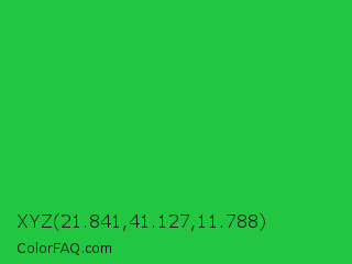 XYZ 21.841,41.127,11.788 Color is a normal green color and the nearest color is Lime Green #32cd32. Hex code #23c641 and RGB value is rgb(35,198,65). In RGB color space, this color is composed of 14% red, 78% green, 25% blue, In CMYK color space, this color is composed of 82% cyan, 0% magenta, 67% yellow , 22% black , In HSL color space, this color has a hue angle of 131° , 70% saturation and 46% lightness.