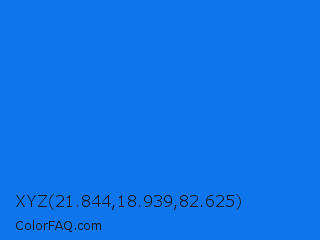 XYZ 21.844,18.939,82.625 Color is a normal blue color and the nearest color is Blue Crayola #1f75fe. Hex code #0f75ed and RGB value is rgb(15,117,237). In RGB color space, this color is composed of 6% red, 46% green, 93% blue, In CMYK color space, this color is composed of 94% cyan, 51% magenta, 0% yellow , 7% black , In HSL color space, this color has a hue angle of 212° , 88% saturation and 49% lightness.