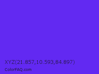 XYZ 21.857,10.593,84.897 Color is a normal indigo color and the nearest color is Han Purple #5218fa. Hex code #6229f2 and RGB value is rgb(98,41,242). In RGB color space, this color is composed of 38% red, 16% green, 95% blue, In CMYK color space, this color is composed of 60% cyan, 83% magenta, 0% yellow , 5% black , In HSL color space, this color has a hue angle of 257° , 89% saturation and 55% lightness.