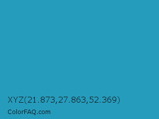 XYZ 21.873,27.863,52.369 Color is a normal cyan color and the nearest color is Eastern Blue #1e9ab0. Hex code #269cbd and RGB value is rgb(38,156,189). In RGB color space, this color is composed of 15% red, 61% green, 74% blue, In CMYK color space, this color is composed of 80% cyan, 17% magenta, 0% yellow , 26% black , In HSL color space, this color has a hue angle of 193° , 67% saturation and 45% lightness.