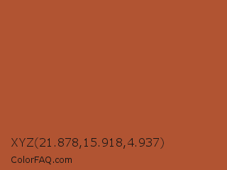 XYZ 21.878,15.918,4.937 Color is a normal orange color and the nearest color is Brown Rust #af593e. Hex code #b15432 and RGB value is rgb(177,84,50). In RGB color space, this color is composed of 69% red, 33% green, 20% blue, In CMYK color space, this color is composed of 0% cyan, 53% magenta, 72% yellow , 31% black , In HSL color space, this color has a hue angle of 16° , 56% saturation and 45% lightness.
