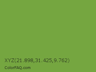 XYZ 21.898,31.425,9.762 Color is a normal green color and the nearest color is Palm Leaf #6f9940. Hex code #75a640 and RGB value is rgb(117,166,64). In RGB color space, this color is composed of 46% red, 65% green, 25% blue, In CMYK color space, this color is composed of 30% cyan, 0% magenta, 61% yellow , 35% black , In HSL color space, this color has a hue angle of 89° , 44% saturation and 45% lightness.