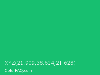 XYZ 21.909,38.614,21.628 Color is a normal green color and the nearest color is Green Crayola #1cac78. Hex code #17bf70 and RGB value is rgb(23,191,112). In RGB color space, this color is composed of 9% red, 75% green, 44% blue, In CMYK color space, this color is composed of 88% cyan, 0% magenta, 41% yellow , 25% black , In HSL color space, this color has a hue angle of 152° , 79% saturation and 42% lightness.