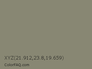 XYZ 21.912,23.8,19.659 Color is a normal yellow color and the nearest color is Bitter #868974. Hex code #888773 and RGB value is rgb(136,135,115). In RGB color space, this color is composed of 53% red, 53% green, 45% blue, In CMYK color space, this color is composed of 0% cyan, 1% magenta, 15% yellow , 47% black , In HSL color space, this color has a hue angle of 57° , 8% saturation and 49% lightness.