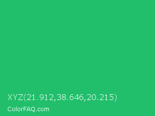 XYZ 21.912,38.646,20.215 Color is a normal green color and the nearest color is Green Crayola #1cac78. Hex code #21bf6b and RGB value is rgb(33,191,107). In RGB color space, this color is composed of 13% red, 75% green, 42% blue, In CMYK color space, this color is composed of 83% cyan, 0% magenta, 44% yellow , 25% black , In HSL color space, this color has a hue angle of 148° , 71% saturation and 44% lightness.