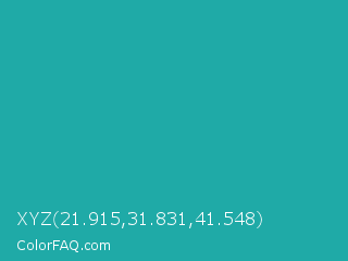 XYZ 21.915,31.831,41.548 Color is a normal cyan color and the nearest color is Light Sea Green #20b2aa. Hex code #1faaa7 and RGB value is rgb(31,170,167). In RGB color space, this color is composed of 12% red, 67% green, 65% blue, In CMYK color space, this color is composed of 82% cyan, 0% magenta, 2% yellow , 33% black , In HSL color space, this color has a hue angle of 179° , 69% saturation and 39% lightness.