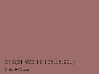 XYZ 21.923,19.125,15.901 Color is a normal red color and the nearest color is Toast #9a6e61. Hex code #9d6d69 and RGB value is rgb(157,109,105). In RGB color space, this color is composed of 62% red, 43% green, 41% blue, In CMYK color space, this color is composed of 0% cyan, 31% magenta, 33% yellow , 38% black , In HSL color space, this color has a hue angle of 5° , 21% saturation and 51% lightness.