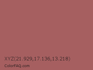 XYZ 21.929,17.136,13.218 Color is a normal red color and the nearest color is Deep Puce #a95c68. Hex code #a65f60 and RGB value is rgb(166,95,96). In RGB color space, this color is composed of 65% red, 37% green, 38% blue, In CMYK color space, this color is composed of 0% cyan, 43% magenta, 42% yellow , 35% black , In HSL color space, this color has a hue angle of 359° , 29% saturation and 51% lightness.