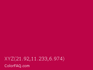 XYZ 21.92,11.233,6.974 Color is a normal rose color and the nearest color is Pictorial Carmine #c30b4e. Hex code #bc0447 and RGB value is rgb(188,4,71). In RGB color space, this color is composed of 74% red, 2% green, 28% blue, In CMYK color space, this color is composed of 0% cyan, 98% magenta, 62% yellow , 26% black , In HSL color space, this color has a hue angle of 338° , 96% saturation and 38% lightness.