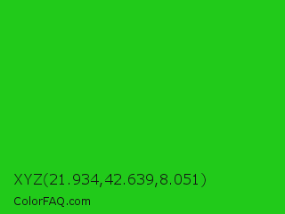 XYZ 21.934,42.639,8.051 Color is a normal green color and the nearest color is Lime Green #32cd32. Hex code #21ca1a and RGB value is rgb(33,202,26). In RGB color space, this color is composed of 13% red, 79% green, 10% blue, In CMYK color space, this color is composed of 84% cyan, 0% magenta, 87% yellow , 21% black , In HSL color space, this color has a hue angle of 118° , 77% saturation and 45% lightness.