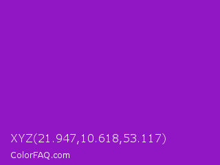 XYZ 21.947,10.618,53.117 Color is a normal purple color and the nearest color is French Violet #8806ce. Hex code #9117c4 and RGB value is rgb(145,23,196). In RGB color space, this color is composed of 57% red, 9% green, 77% blue, In CMYK color space, this color is composed of 26% cyan, 88% magenta, 0% yellow , 23% black , In HSL color space, this color has a hue angle of 282° , 79% saturation and 43% lightness.