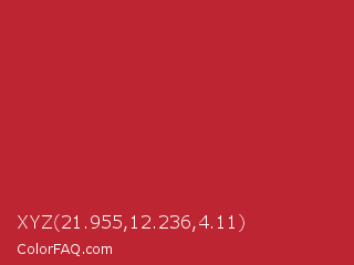 XYZ 21.955,12.236,4.11 Color is a normal red color and the nearest color is Cardinal #c41e3a. Hex code #bc2531 and RGB value is rgb(188,37,49). In RGB color space, this color is composed of 74% red, 15% green, 19% blue, In CMYK color space, this color is composed of 0% cyan, 80% magenta, 74% yellow , 26% black , In HSL color space, this color has a hue angle of 355° , 67% saturation and 44% lightness.