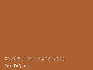 XYZ 21.971,17.472,5.12 Color is a normal orange color and the nearest color is Brown Rust #af593e. Hex code #ad6031 and RGB value is rgb(173,96,49). In RGB color space, this color is composed of 68% red, 38% green, 19% blue, In CMYK color space, this color is composed of 0% cyan, 45% magenta, 72% yellow , 32% black , In HSL color space, this color has a hue angle of 23° , 56% saturation and 44% lightness.