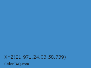 XYZ 21.971,24.03,58.739 Color is a normal blue color and the nearest color is Cyan Blue Azure #4682bf. Hex code #3f8cc9 and RGB value is rgb(63,140,201). In RGB color space, this color is composed of 25% red, 55% green, 79% blue, In CMYK color space, this color is composed of 69% cyan, 30% magenta, 0% yellow , 21% black , In HSL color space, this color has a hue angle of 207° , 56% saturation and 52% lightness.