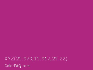 XYZ 21.979,11.917,21.22 Color is a normal magenta color and the nearest color is Fandango #b53389. Hex code #ae267f and RGB value is rgb(174,38,127). In RGB color space, this color is composed of 68% red, 15% green, 50% blue, In CMYK color space, this color is composed of 0% cyan, 78% magenta, 27% yellow , 32% black , In HSL color space, this color has a hue angle of 321° , 64% saturation and 42% lightness.
