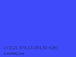 XYZ 21.979,13.054,92.628 Color is a light blue color and the nearest color is Ultramarine Blue #4166f5. Hex code #3f4bfb and RGB value is rgb(63,75,251). In RGB color space, this color is composed of 25% red, 29% green, 98% blue, In CMYK color space, this color is composed of 75% cyan, 70% magenta, 0% yellow , 2% black , In HSL color space, this color has a hue angle of 236° , 96% saturation and 62% lightness.