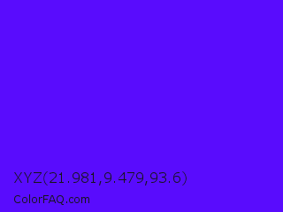 XYZ 21.981,9.479,93.6 Color is a normal indigo color and the nearest color is Han Purple #5218fa. Hex code #590cfd and RGB value is rgb(89,12,253). In RGB color space, this color is composed of 35% red, 5% green, 99% blue, In CMYK color space, this color is composed of 65% cyan, 95% magenta, 0% yellow , 1% black , In HSL color space, this color has a hue angle of 259° , 98% saturation and 52% lightness.
