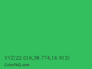 XYZ 22.016,38.774,16.913 Color is a normal green color and the nearest color is Medium Sea Green #3cb371. Hex code #33bf5e and RGB value is rgb(51,191,94). In RGB color space, this color is composed of 20% red, 75% green, 37% blue, In CMYK color space, this color is composed of 73% cyan, 0% magenta, 51% yellow , 25% black , In HSL color space, this color has a hue angle of 138° , 58% saturation and 47% lightness.
