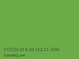 XYZ 22.019,33.112,11.534 Color is a normal green color and the nearest color is Palm Leaf #6f9940. Hex code #6bac49 and RGB value is rgb(107,172,73). In RGB color space, this color is composed of 42% red, 67% green, 29% blue, In CMYK color space, this color is composed of 38% cyan, 0% magenta, 58% yellow , 33% black , In HSL color space, this color has a hue angle of 99° , 40% saturation and 48% lightness.